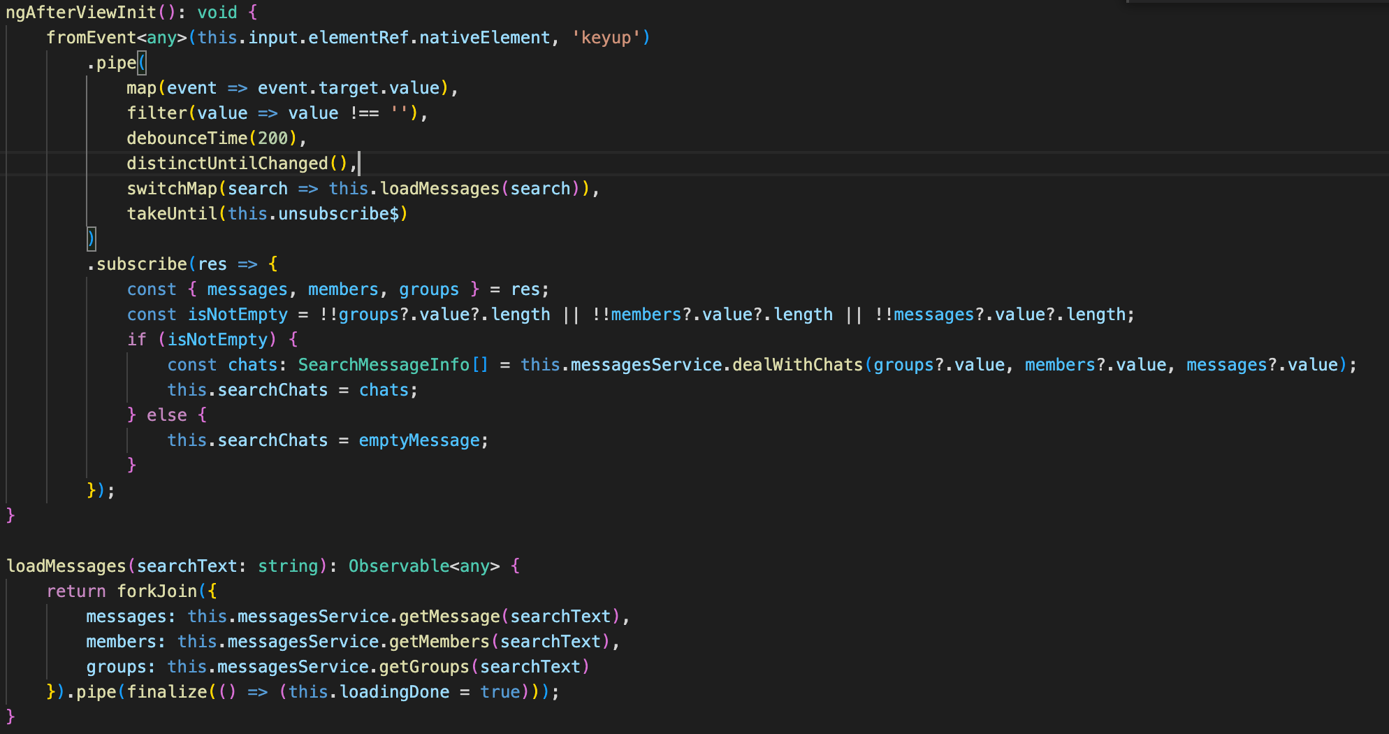首先使用 forkJoin 来聚合三个 Observable,避免了订阅的层层嵌套,使用 fromEvent 操作符替代 input 的 keyup 事件,map 操作符处理流发出输入的值,filter 过滤掉空字符串,不会发送请求,debounceTime 进行防抖处理,用户可以键入一个值,按退格键并再次键入,这可能会导致重复的搜索值。 我们可以通过添加 distinctUntilChanged 操作符来防止重复搜索的发生。switchMap 操作符的作用是如果连续发送了两次请求,且都没有请求完成,则可以取消之前的搜索。最后使用 takeUnit 操作符来管理取消订阅。
