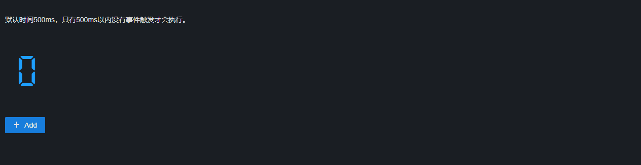 | <div class="syn-margin-24"> <p> 默认时间500ms,只有500ms以内没有事件触发才会执行。 </p> <div class="syn-margin-24 label-font"> {{total}} </div> <button nz-button nzType="primary" (click)="add($event)"> <i nz-icon nzType="plus" nzTheme="outline"></i> Add </button> </div>